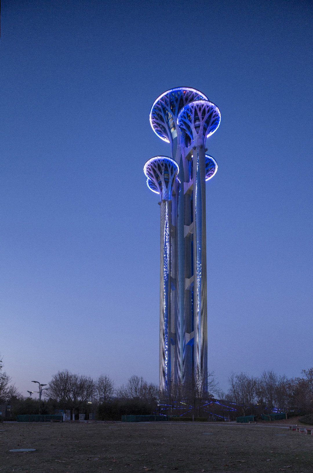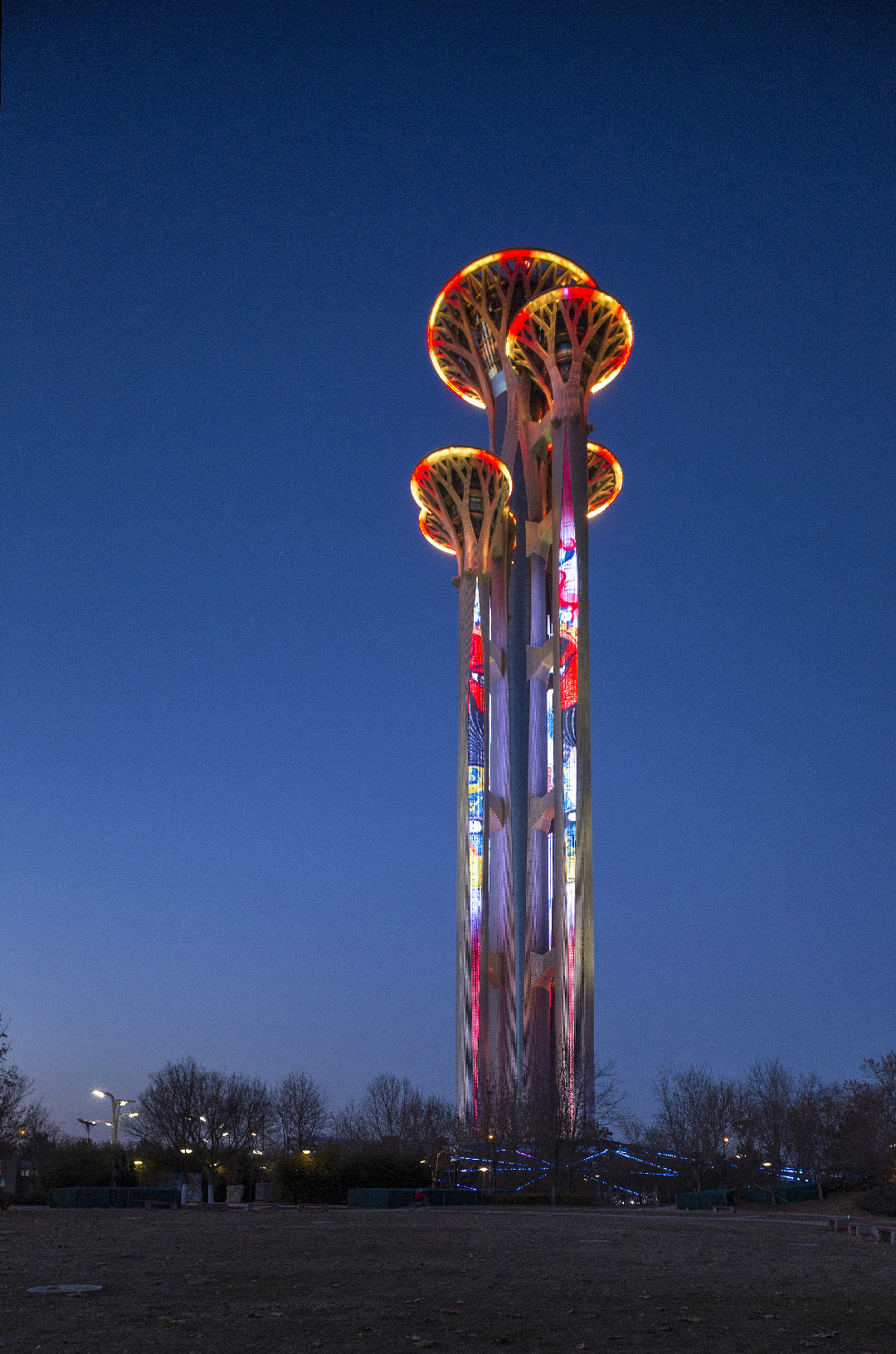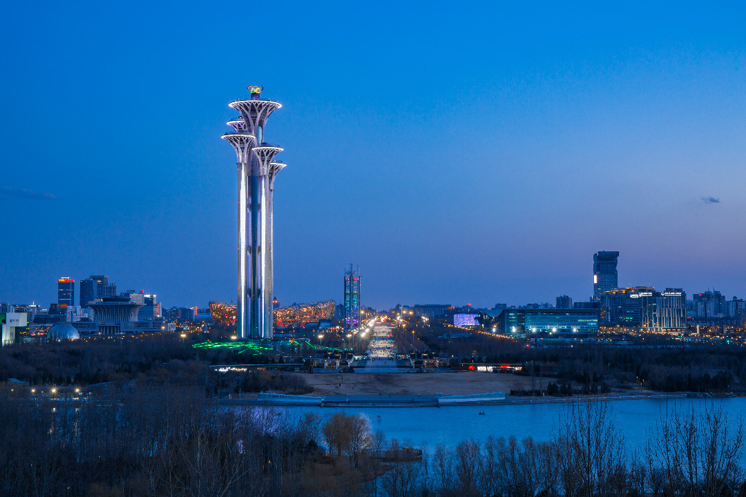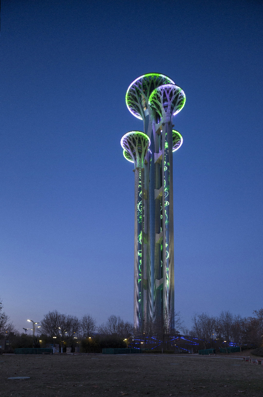 奥林匹克观光塔是世界上唯一一个由五个塔独立组成的,最高处为246.8米,由5座高度不等、错落有致的五环图案作为塔的基本造型,观光塔全部采用LED 节能灯具。